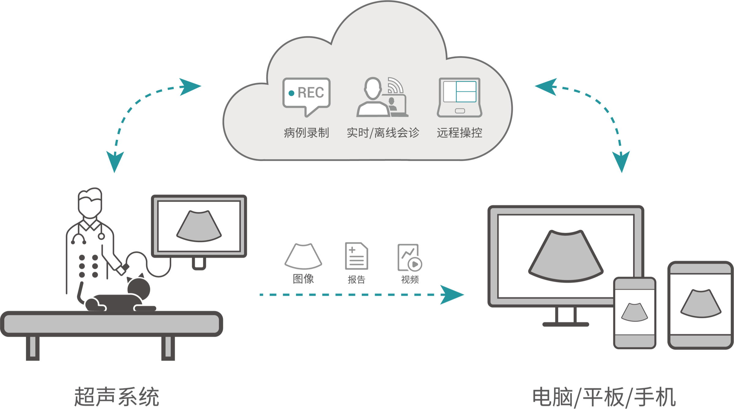 一键发起远程会诊,可将超声设备的屏幕信息实时共享至移动端,帮助动物医生进行远程医疗咨询和指导。